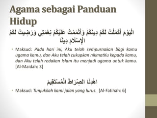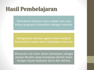 Agama di sisi Allah yang dibawa oleh Nabi Muhammad SAW sebagai kesinambungan daripada nabi-nabi yang terdahulu. Hasil Pembelajaran Memahami bahawa Islam adalah satu cara hidup yang perlu diamalkan sebagai manusia. Kerana Islam diturunkan untuk semua manusia.